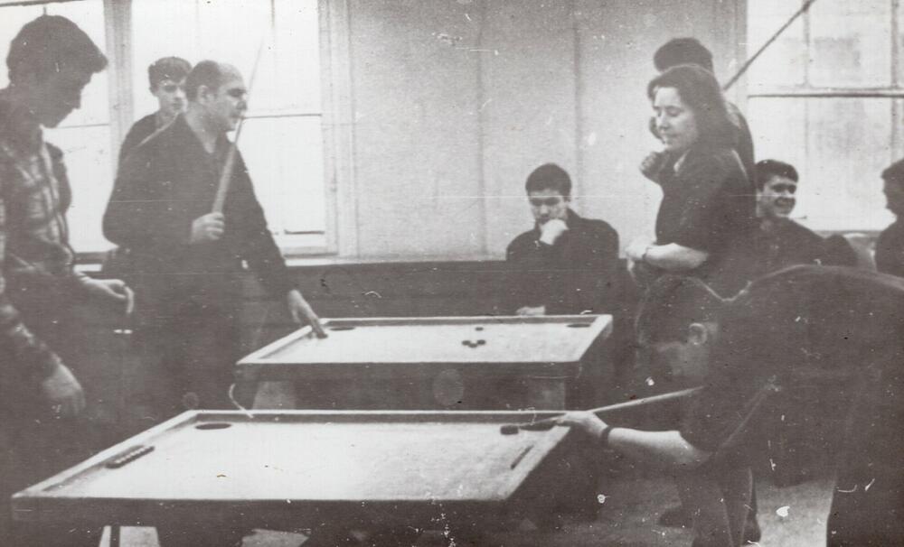 Valsts elektrotehniskā fabrika (VEF). Eksperimentālā ceha darbinieki spēlē novusu pusdienlaika pārtraukumā.