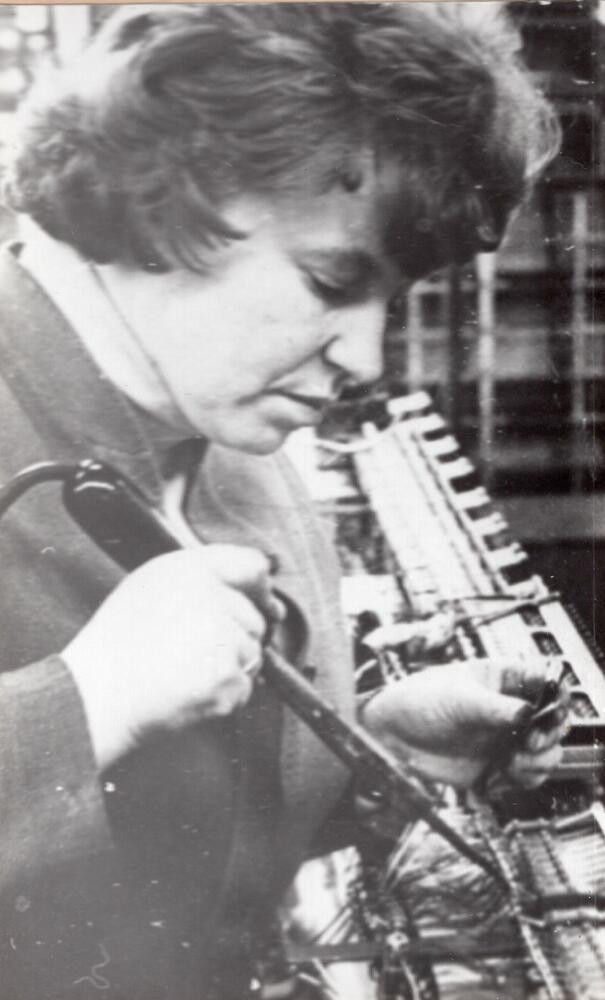 Valsts elektrotehniskā fabrika (VEF). Telefonijas ceha montiere, komunistiskā darba triecienniece Gaida Zariņa darba laikā.