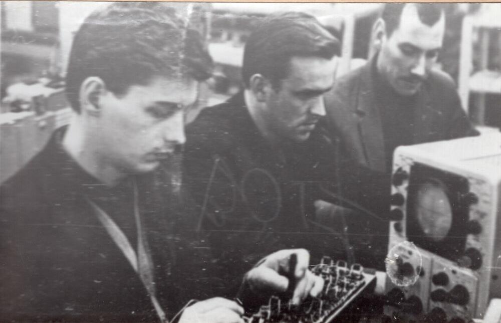 Valsts elektrotehniskā fabrika (VEF). Releju shēmu ceha regulētāji G. Ezergailis (no kreisās), A. Jansons un D. Dombrovskis darba laikā.