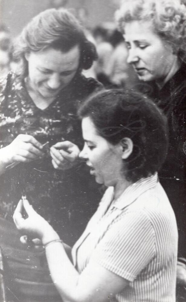 Valsts elektrotehniskā fabrika (VEF). 7. ceha montieres, komunistiskā darba trieciennieces T. Jevdokimova (priekšplānā), A. Volkova (otrā plānā no kreisās) un Z. Haritonova darba laikā.