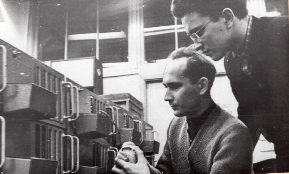 Valsts elektrotehniskā fabrika (VEF). Tehniskās pētniecības nodaļas (TPN) inženieris- konstruktors Gunārs Muša (no kreisās) un vecākais elektronikas tehniķis Vilnis Kalniņš pie jaunās ražošanas iekārtas.