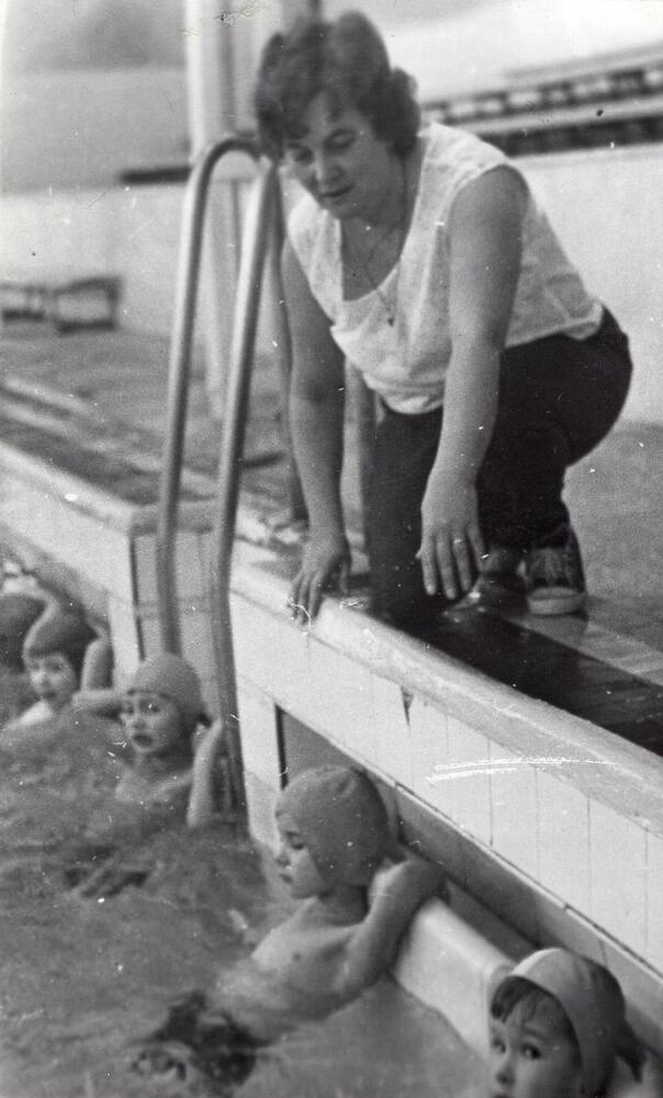 Peldēšanas nodarbības bērniem Valsts elektrotehniskās fabrikas (VEF) peldbaseinā. Nodarbības vada trenere N. Pultraka.