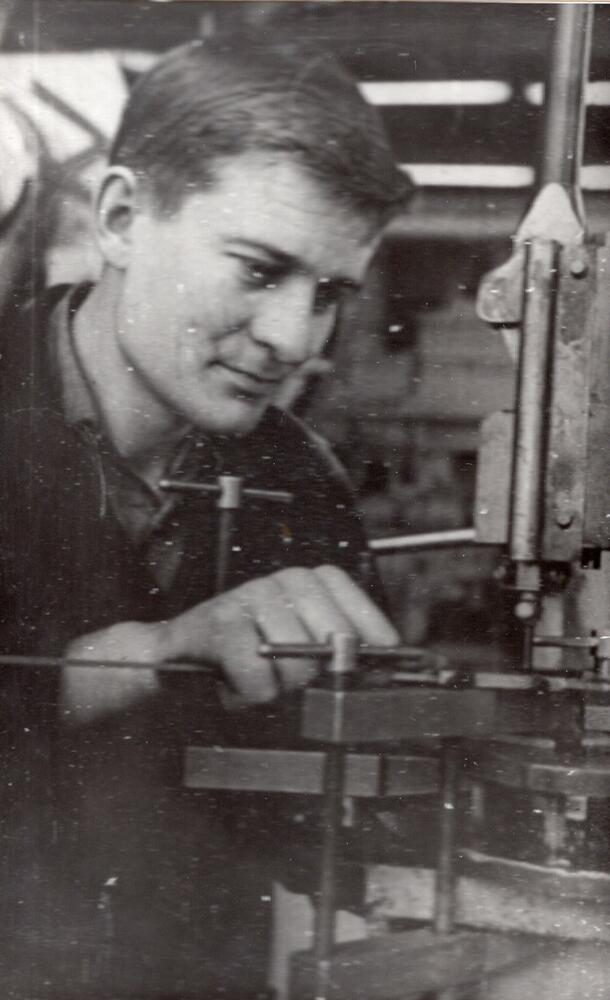 Valsts elektrotehniskā fabrika (VEF). 4. ceha atslēdznieks, komunistiskā darba trieciennieks, Rīgas pilsētas Proletāriešu rajona (tagad Vidzemes priekšpilsēta) Tautas deputātu Padomes deputāts Jurijs Grahoļskis pie darba galda.