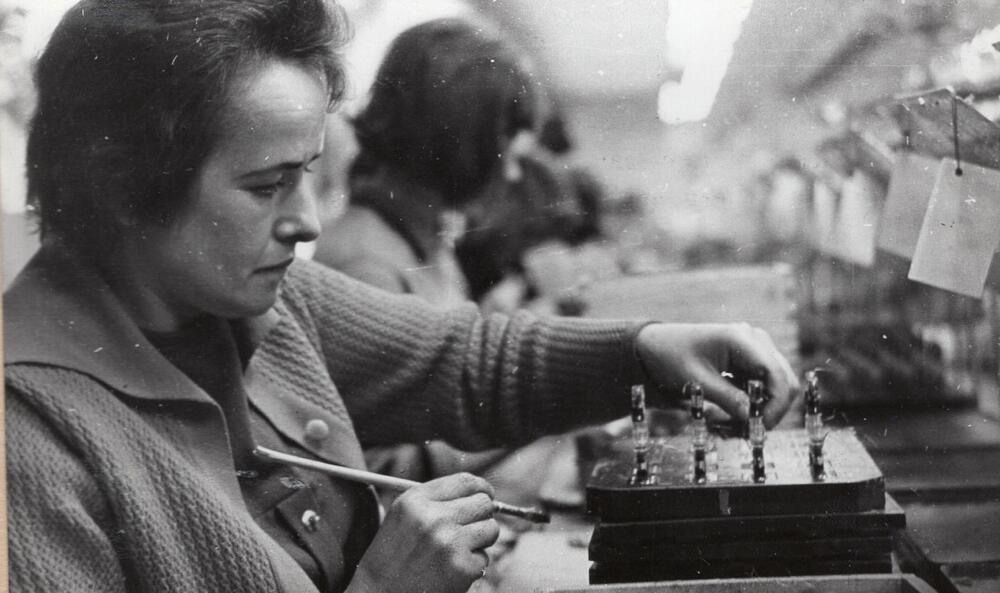 Valsts elektrotehniskās fabrikas (VEF) radio cehs. Montiere Leontīne Jermaka veic radiolas "VEF-Radio" montāžu.