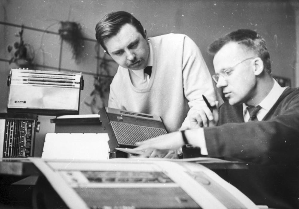 Rūpnīcas “VEF” inženieri J. Gals (no kreisās) un I. Robežnieks darba procesā.