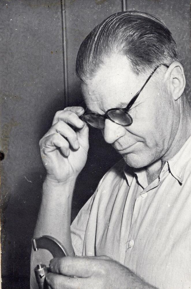 Valsts elektrotehniskās fabrikas (VEF) instrumentālā ceha atslēdznieks Daniels Jansons darba laikā. Otrā Pasaules kara laikā dienējis latviešu strēlnieku divīzijā.