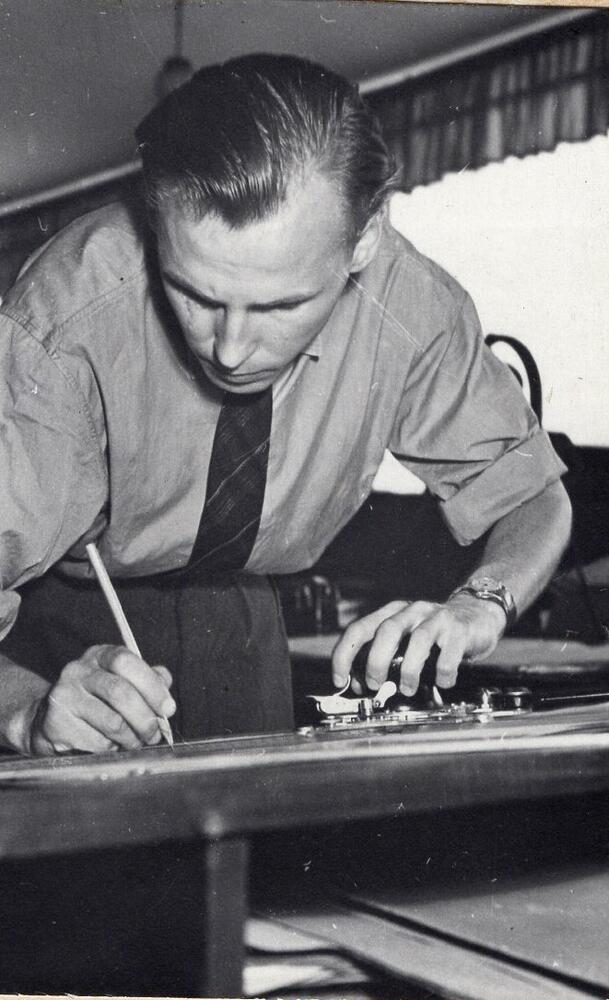 Valsts elektrotehniskā fabrika (VEF). Jaunās tehnoloģijas ceha konstruktoru biroja vecākais inženieris Gunārs Freibergs darba laikā.