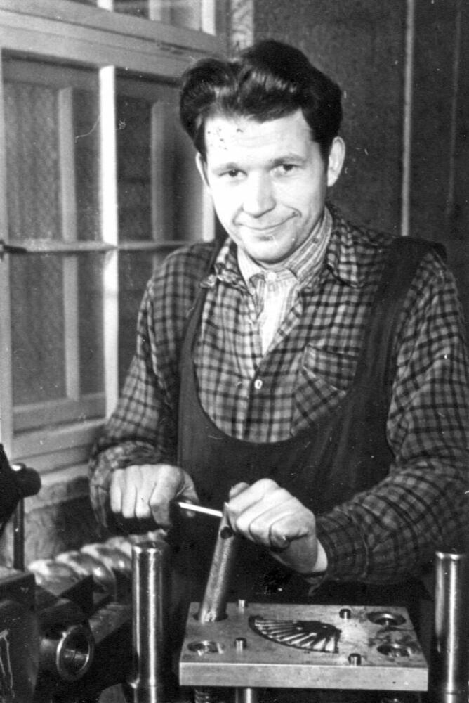 Valsts elektrotehniskās fabrikas (VEF) instrumentālā ceha atslēdznieks Ludis Miķelsons pie darba galda.