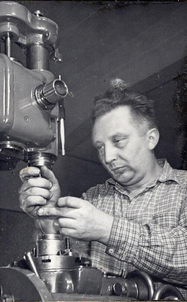 Valsts elektrotehniskā fabrika (VEF). Instrumentu ceha urbējs Eduards Bunte pie darba galda.