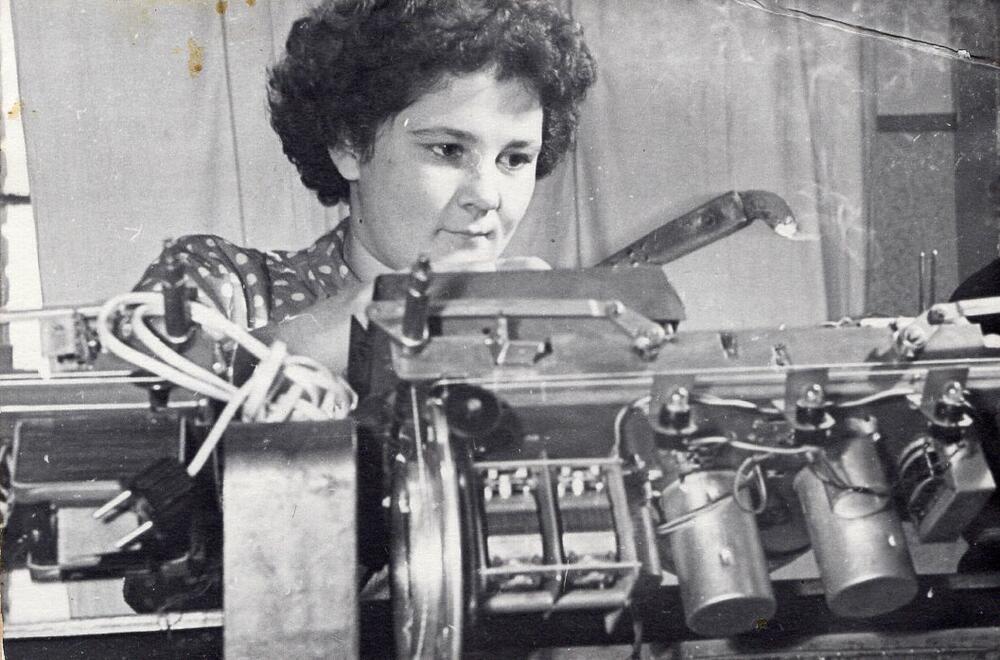 Valsts elektrotehniskās fabrikas (VEF) radio ceha brigadiere, ražošanas pirmrindniece Vija Bembere pie darba galda.