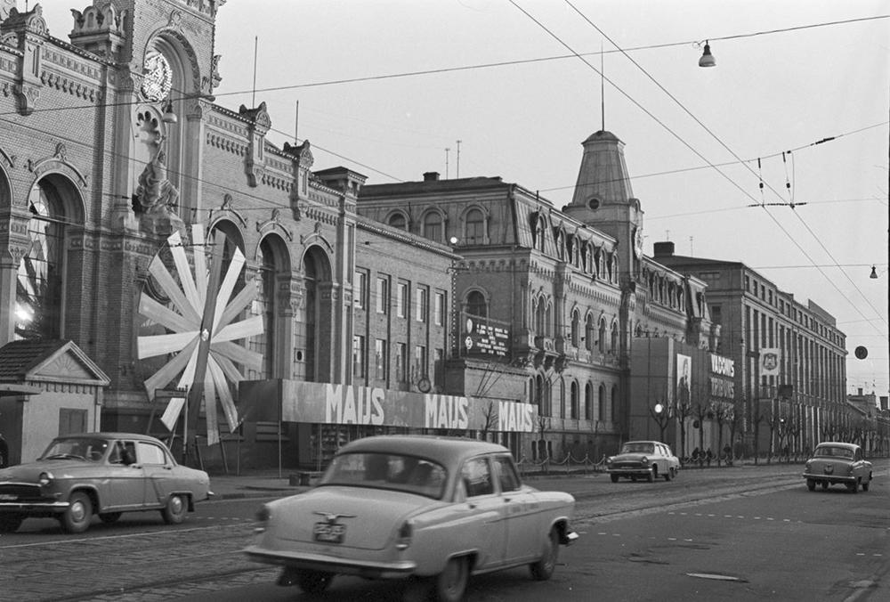 Izdekorētais Valsts elektrotehniskās fabrikas (VEF) galvenais korpuss Ļeņina ielā (tagad Brīvības gatve) Pirmā maija svinību priekšvakarā.