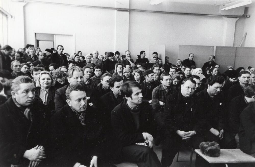 Valsts elektrotehniskās fabrikas (VEF) kolektīva sapulce, kurā tiek apspriesti ražošanas kvalitātes uzlabošanas jautājumi.
