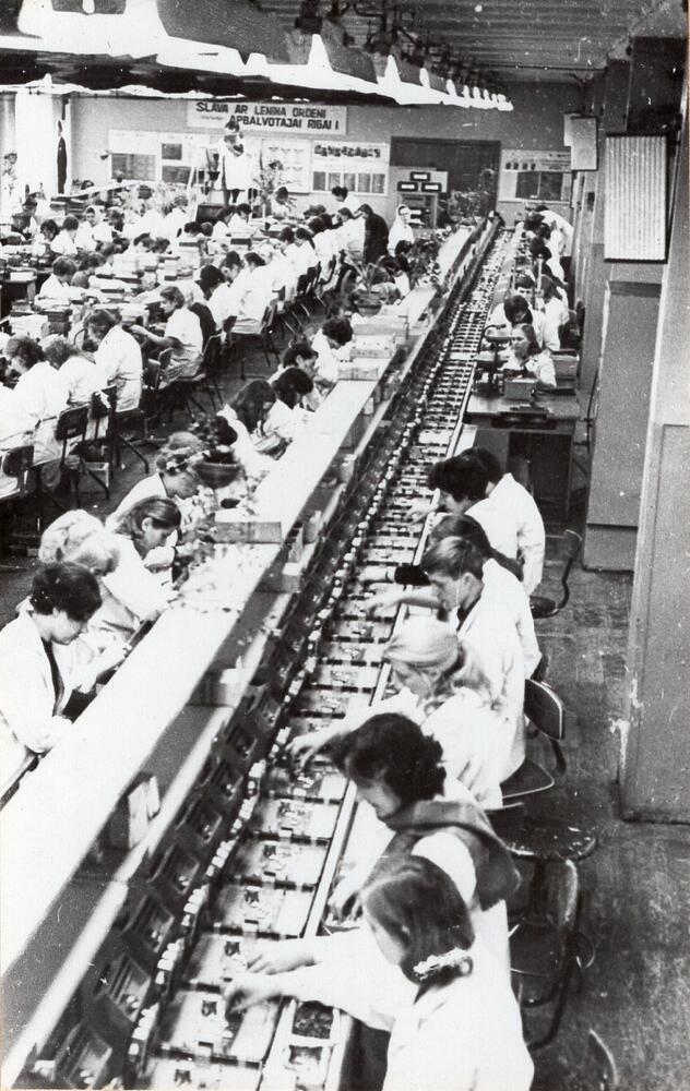 Valsts elektrotehniskās fabrikas (VEF) radio cehs. Darba process pie montāžas konveijera.
