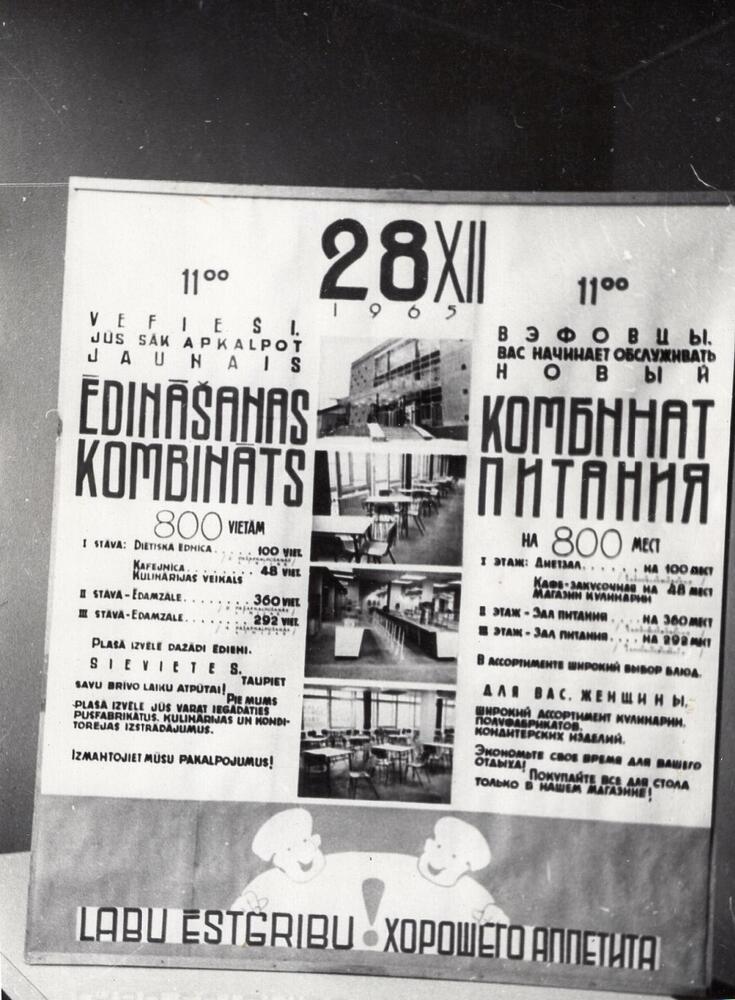 Valsts elektrotehniskās fabrikas ēdināšanas kombināta atklāšanas reklāmas plakāts