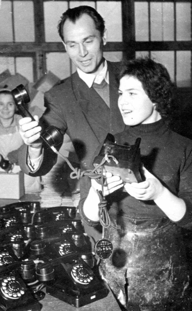 Valsts elektrotehniskās fabrikas (VEF) ražotie telefona aparāti "Bagta", kas tika ražoti pēc Irākas pasūtījuma. Priekšplānā: pakotāja Alla Volgina.