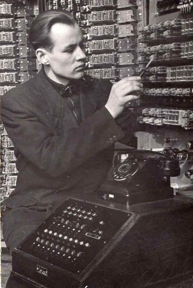 Valsts elektrotehniskā fabrika (VEF). Telefonijas ceha montieris Raimonds Līkums veic automātiskās telefona centrāles montāžu.
