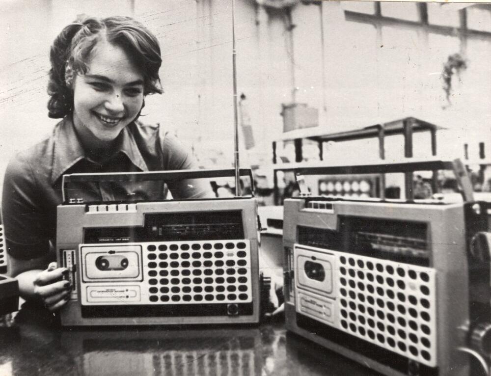 Valsts elektrotehniskās fabrikas (VEF) darbiniece demonstrē jauno produkciju - magnetolas "VEF Sigma".