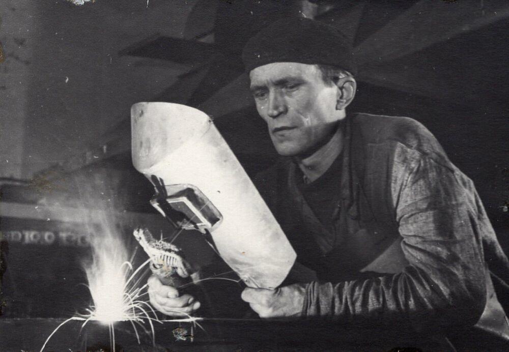 Valsts elektrotehniskās fabrikas (VEF) metinātājs Tims darba laikā.
