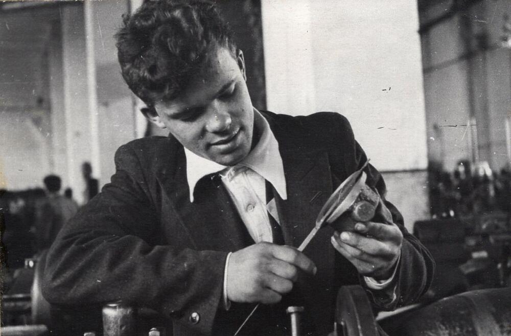 Valsts elektrotehniskās fabrikas (VEF) virpotājs Eduards Freinbergs pie darba galda.