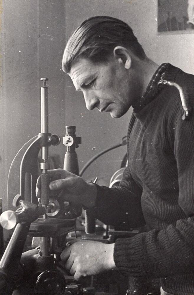 Valsts elektrotehniskās fabrikas (VEF) stahanovietis Ēriks Straubergs pie darba galda.