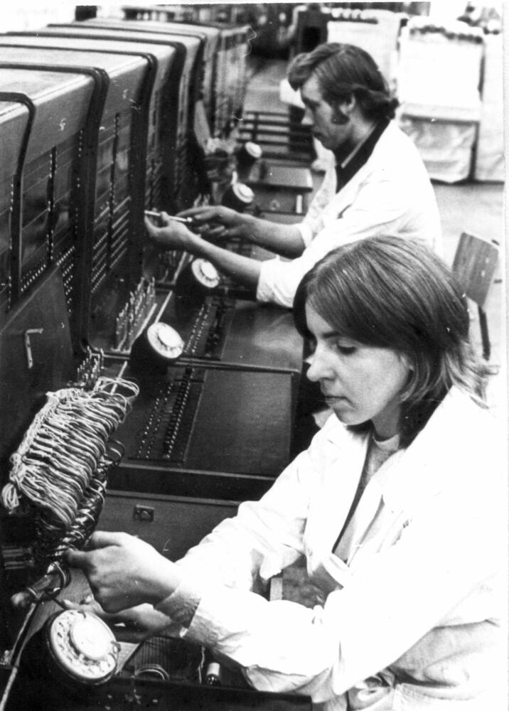 Valsts elektrotehniskā fabrika (VEF). Telefona centrāļu ceha montiere L. Graudule (priekšplānā) darba laikā.