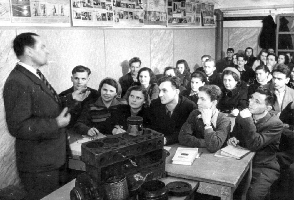 Traktortehnikas vispārējās uzbūves kursi Valsts elektrotehniskās fabrikas (VEF) mācību metodiskajā kabinetā. Nodarbības vada kabineta vadītājs N. Šurs.