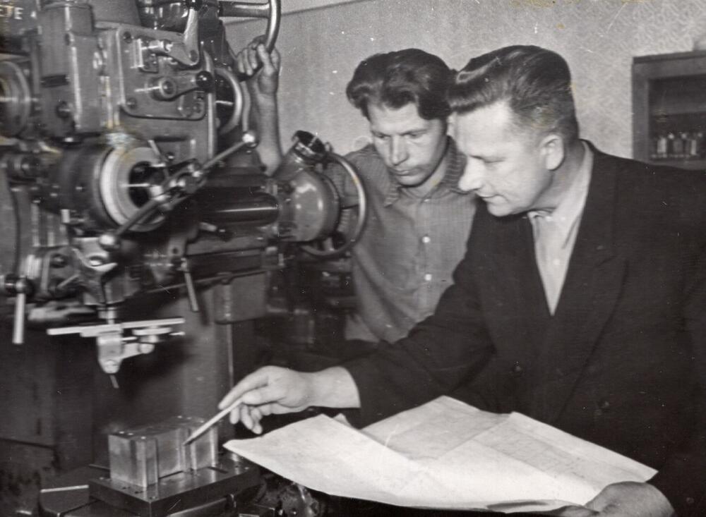Valsts elektrotehniskās fabrikas (VEF) atslēdznieks, racionalizators L. Miķelsons (no kreisās) un inženieris O. Vītoliņš pie darba galda.