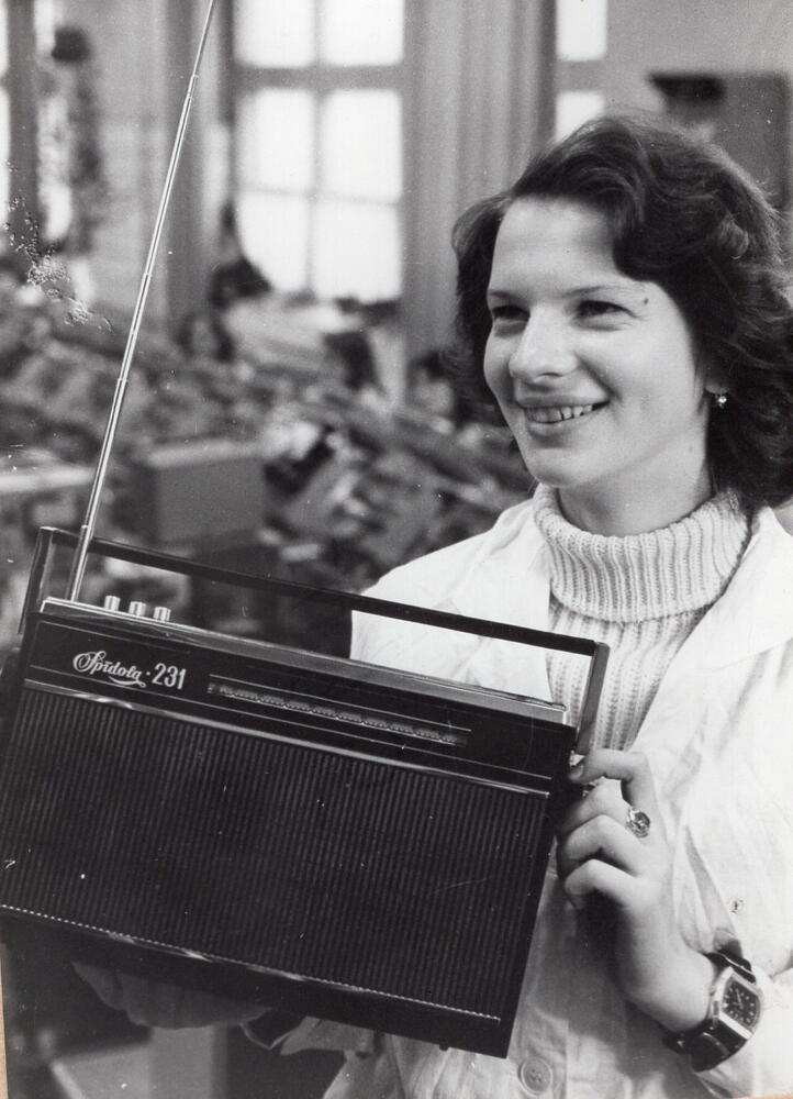 Valsts elektrotehniskās fabrikas (VEF) montieratslēdzniece Gunta Antoneviča demonstrē tranzistoru radiouztvērēju "Spīdola - 231".