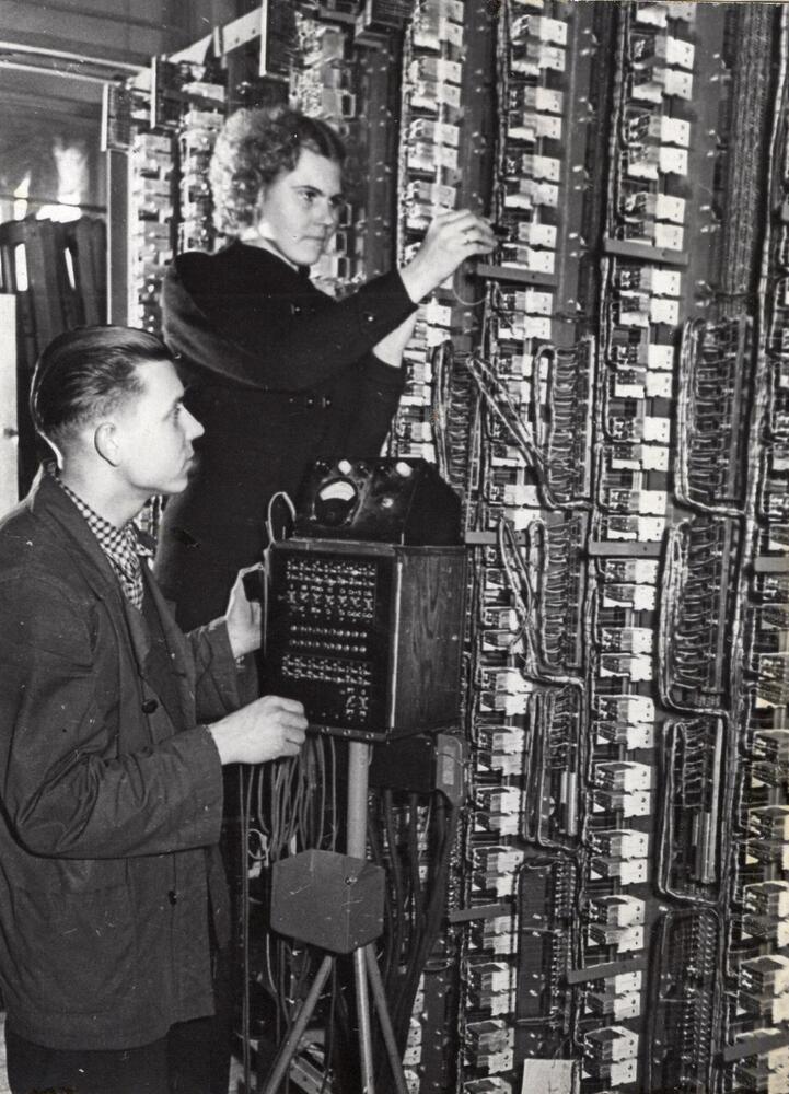 Valsts elektrotehniskās fabrikas (VEF) montieris I. Ziemelis (no kreisās) un lodētāja L. Eglīte veic automātiskās telefona stacijas montāžu.