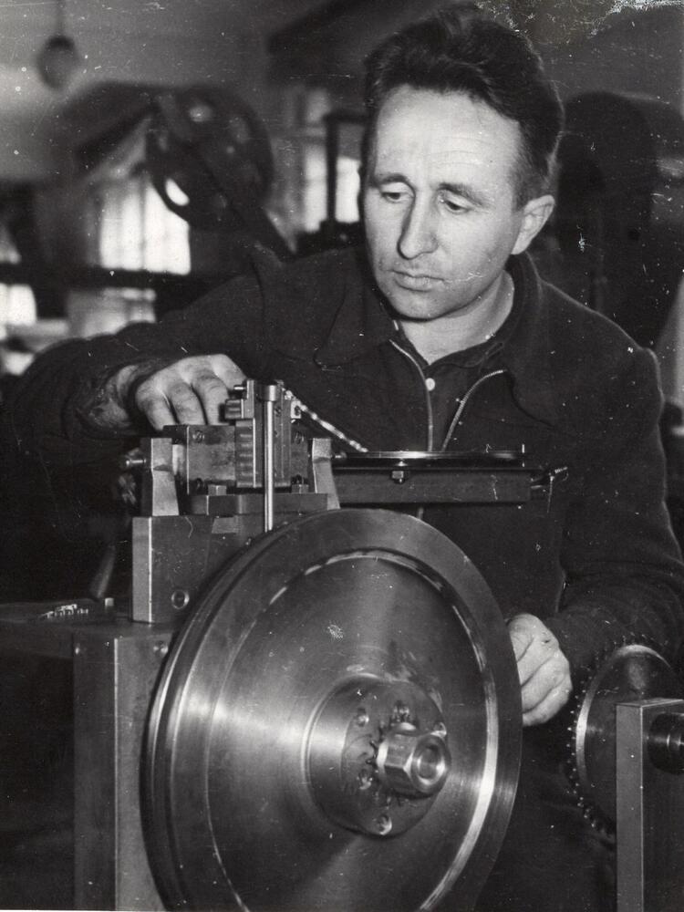 Valsts elektrotehniskā fabrika (VEF). Štancēšanas automātu izgatavošanas iecirkņa vadītājs, instrumentu atslēdznieks, ražošanas novators, Sociālistiskā Darba Varonis Voldemārs Bušs pie štancēšanas automāta, kas paredzēts sarežģītu konfigurāciju atsperu izgatavošanai.