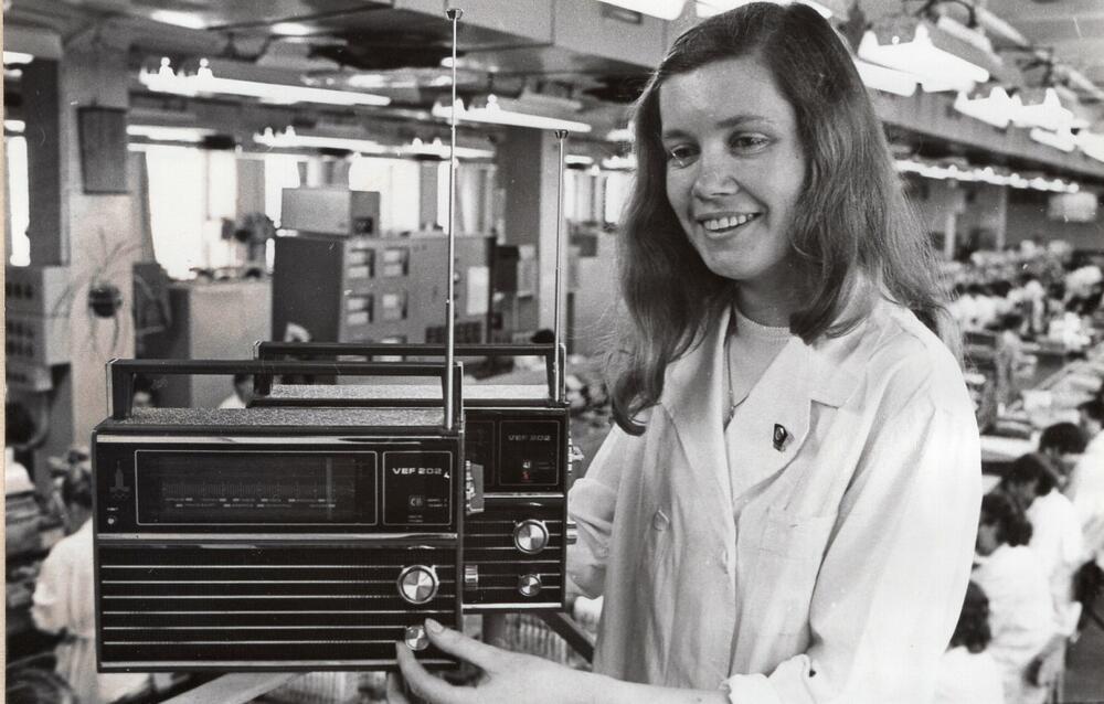 Valsts elektrotehniskā fabrika (VEF). Radio ceha montiere M. Kalniņa demonstrē tranzistoru radiouztvērēju "VEF - 202".