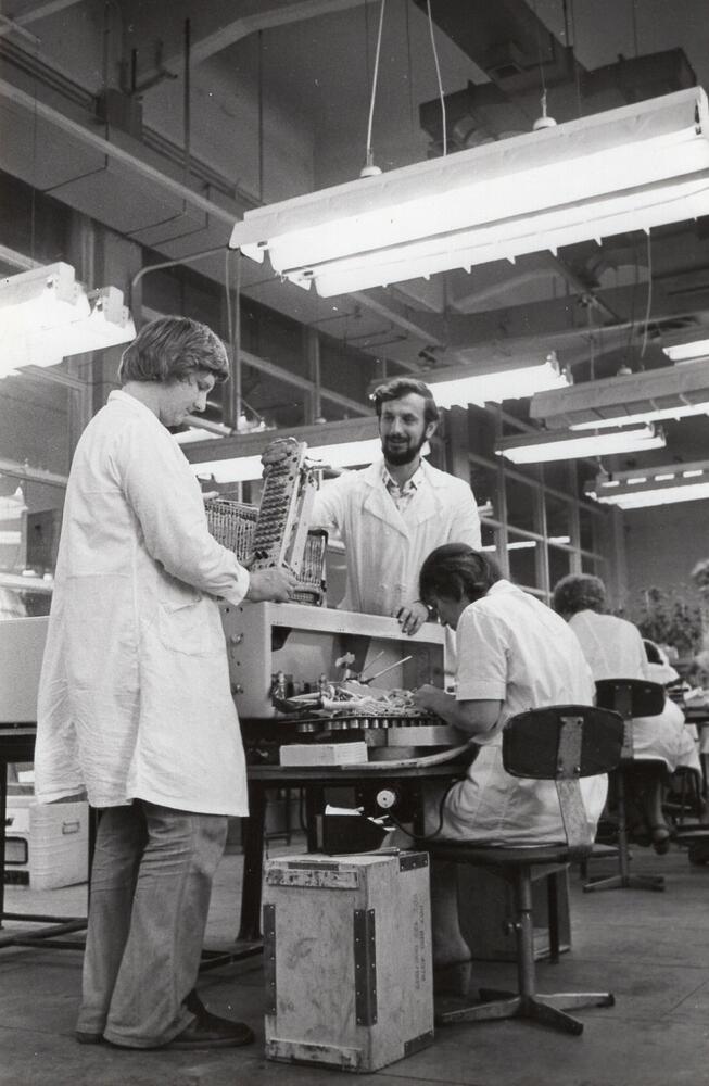 Valsts elektrotehniskās fabrikas (VEF) montāžas cehs. ХХII vasaras olimpisko spēļu tiesāšanas iekārtu montāža.