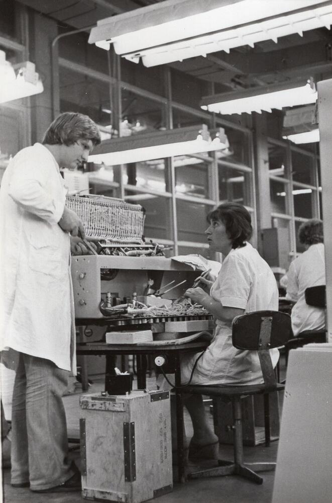 Valsts elektrotehniskā fabrika (VEF). Telefonijas ceha atslēdznieks V. Varčilo un montiere I. Oļšanska veic jaunās telefona centrāles montāžu.
