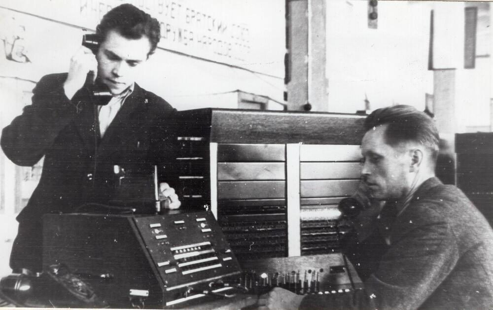 Valsts elektrotehniskās fabrikas (VEF) telefonijas cehs. Tehniskās kontroles nodaļas kontrolieris N. Robinsons (no kreisās) un ceha meistars J. Labrencs veic komutatora kvalitātes kontroli.