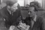 Valsts elektrotehniskās fabrikas (VEF) konstruktoru biroja inženieri M. Zaleskis (no kreisās) un F. Gajšutis darba laikā.