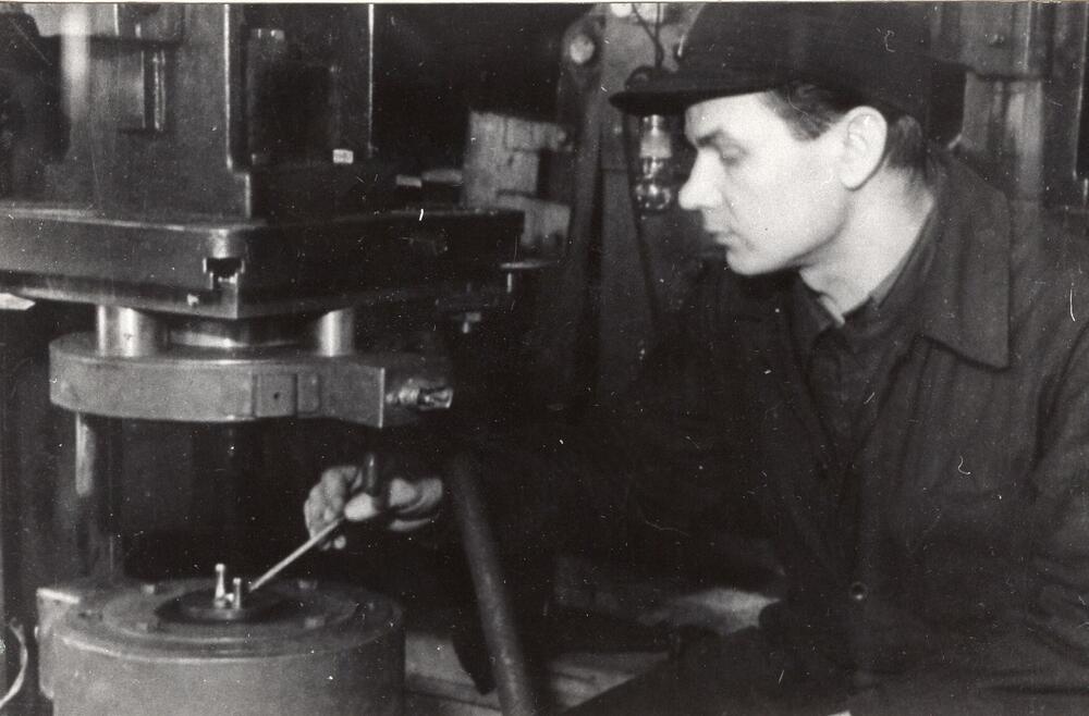 Valsts elektrotehniskā fabrika (VEF). Elektrotehniskā ceha brigadieris, ražošanas pirmrindnieks Rūdolfs Brunovs pie darba galda.
