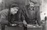 Valsts elektrotehniskās fabrikas (VEF) liešanas ceha formētāji A. Krivokoritovs (no kreisās) un V. Kebergs darba laikā. Savus dienas uzdevumus sistemātiski veic ar 360% lielu uzviju.