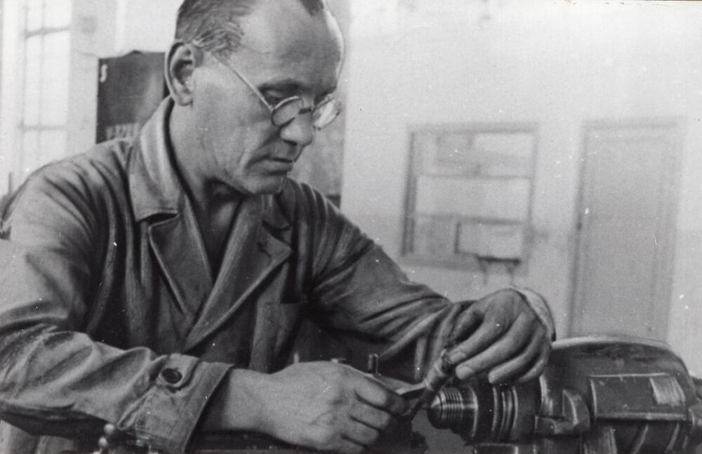 Valsts elektrotehniskās fabrikas (VEF) mehāniskā ceha virpotājs Hinipelis darba laikā.