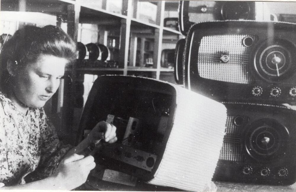 Valsts elektrotehniskās fabrikas (VEF) radio ceha montiere Valentīna Savinkova darba laikā.