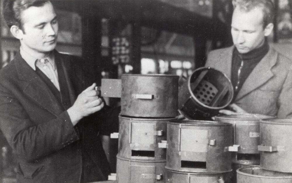 Valsts elektrotehniskās fabrikas (VEF) tautas patēriņa preču ražošanas cehs. Dispečers V. Rinda (no kreisās) un ceha brigadieris K. Jākobsons veic gatavās produkcijas kvalitātes kontroli.