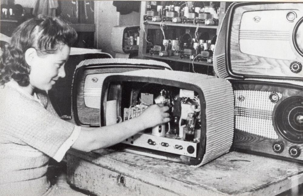 Valsts elektrotehniskā fabrika (VEF). Radio ceha montiere, ražošanas pirmrindniece J. Maksimova darba laikā.