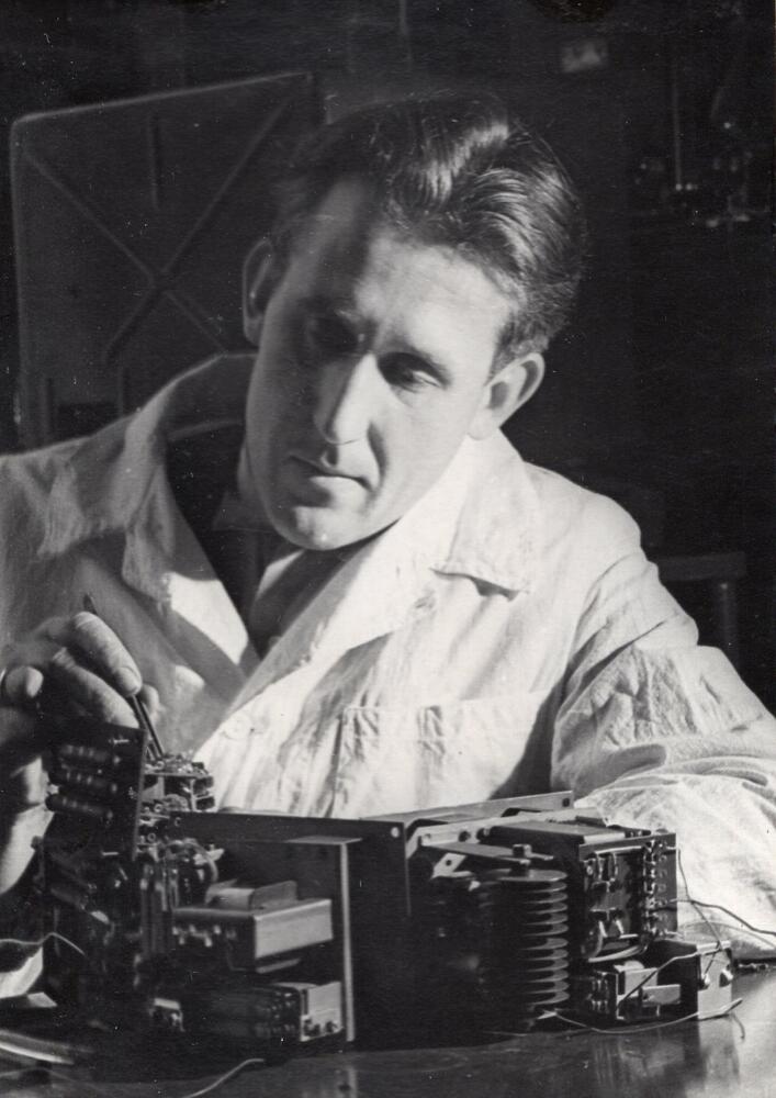 Valsts elektrotehniskā fabrika (VEF). Radioaktīvo izotopu laboratorijas regulētājs J. Krūmiņš veic strāvas tilpuma blīvuma regulēšanas iekārtas montāžu.