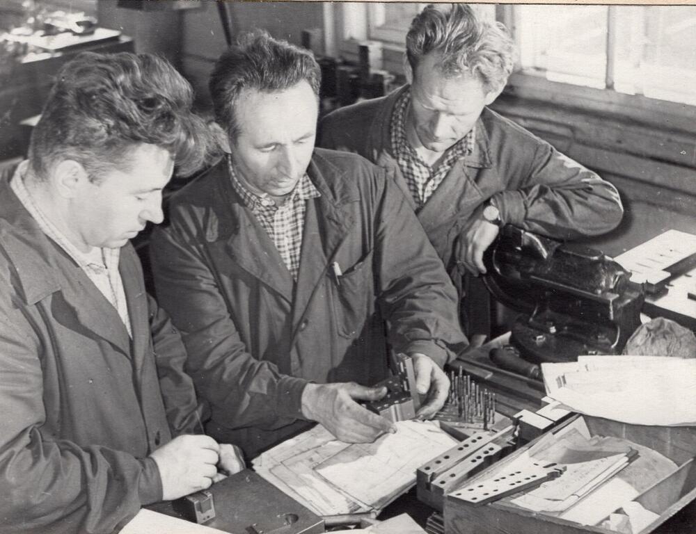 Valsts elektrotehniskā fabrika (VEF). Atslēdznieks I. Šraders (no kreisās), štancēšanas automātu izgatavošanas iecirkņa vadītājs, instrumentu atslēdznieks, ražošanas novators, Sociālistiskā Darba Varonis Voldemārs Bušs un atslēdznieks J. Zaderņuks risina novatoriskus jautājumus.