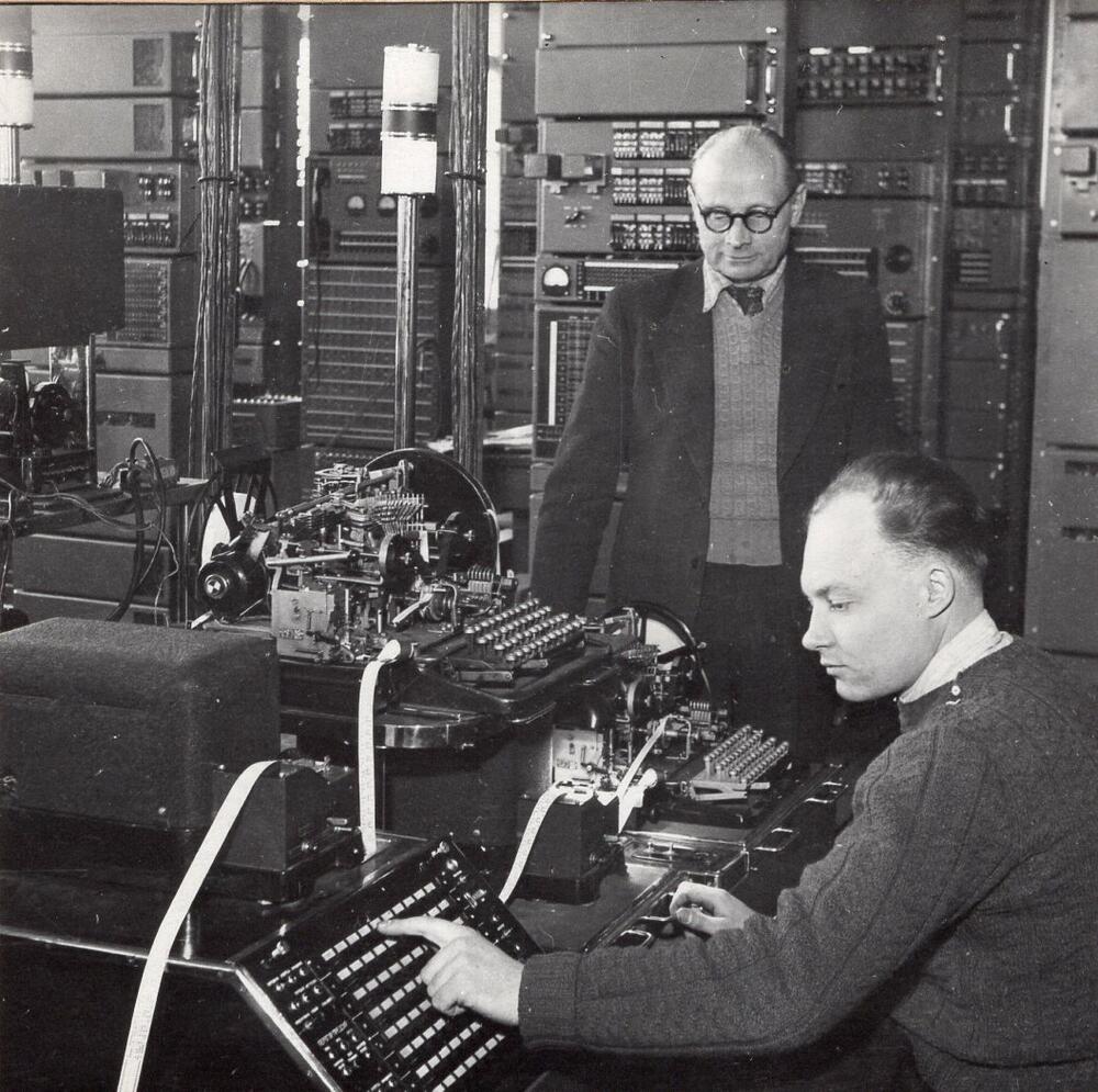 Valsts elektrotehniskā fabrika (VEF). Specializētā konstruktoru biroja vadītājs Augusts Ratnieks (stāv) un inženieris R. Meirāns pie automātiskās telegrāfu centrāles.