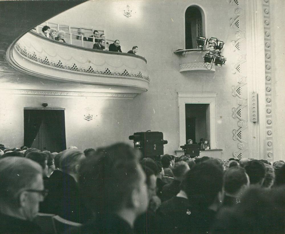 Rīgas Politehniskā institūta (tagadējā Rīgas Tehniskā universitāte) 100 gadu jubilejas svinības Valsts elektrotehniskās fabrikas VEF kultūras pilī. Skats uz skatītājiem zālē.