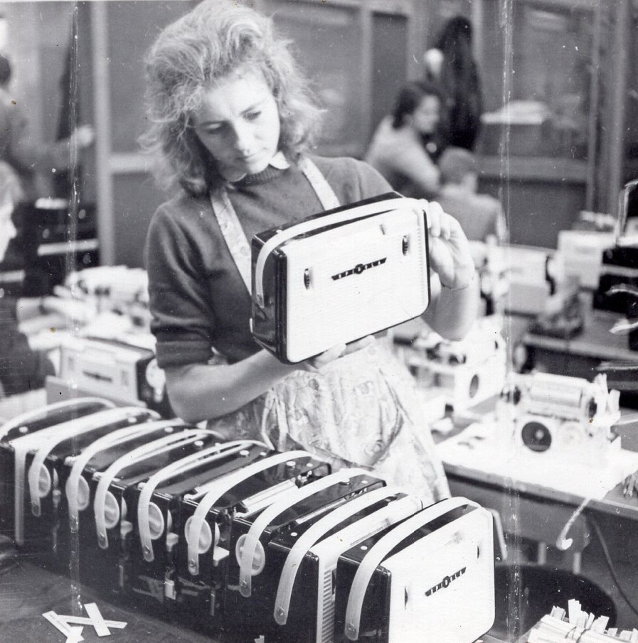 Valsts elektrotehniskā fabrika (VEF). Radio ceha tranzistoru radiouztvērēju "Spīdola" montāžas iecirkņa montiere V. Garklāva darba laikā.