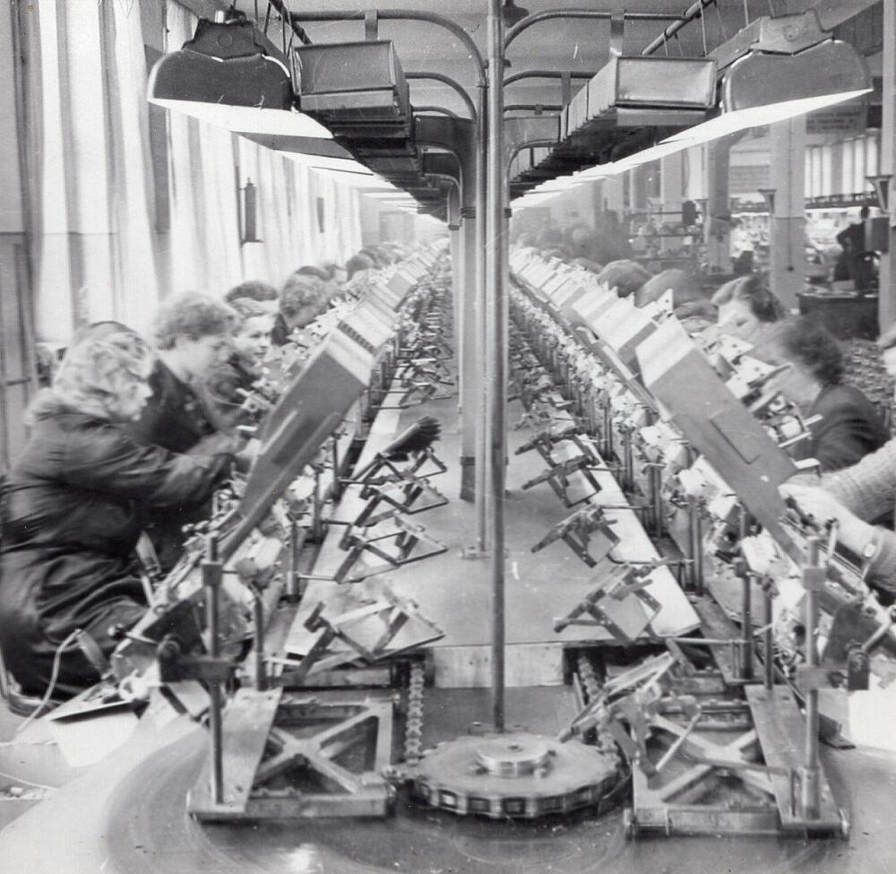 Valsts elektrotehniskā fabrika (VEF). Ražošanas process radio cehā pie montāžas konveijera.