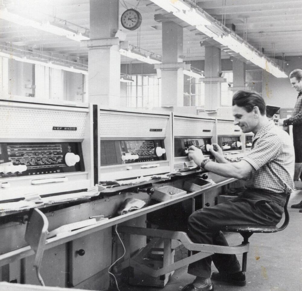 Valsts elektrotehniskās fabrikas (VEF) montāžas cehs. Darba process pie lampu radiolu "VEF Radio" montāžas konveijera.