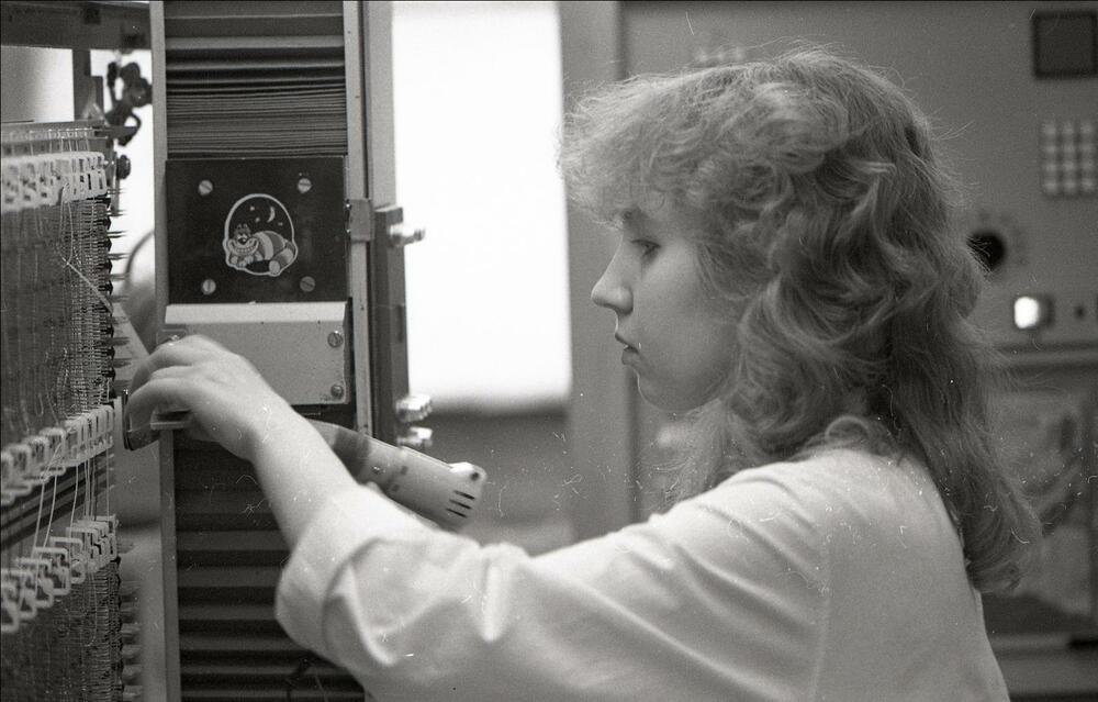 Valsts elektrotehniskās fabrikas (VEF) darbiniece pie ražošanas iekārtas vienā no uzņēmuma cehiem.