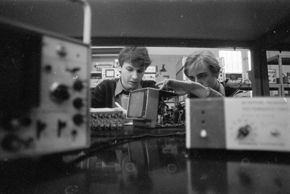 Vladimirs Ševe (no kreisās) un Aivars Mertenss ražošanas apvienības "VEF" DOSAAF (Brīvprātīgā Armijas, aviācijas un flotes veicināšanas biedrība) komitejas tehnisko sporta veidu kluba radioaparātu un televizoru konstruēšanas sekcijas nodarbībās.
